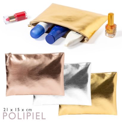 Neceser de polipiel en elegante acabado metalizado. Con cierre de cremallera y tirador a juego disponible en colores dorado, plateado y oro rosa.