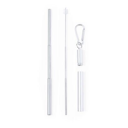 Pajita reutilizable y extensible en acero inox, con boquilla de silicona. Con accesorio limpiador incluido y presentada en estuche a juego con mosquetón para transporte. Extensible. Reutilizable. Limpiador Incluido