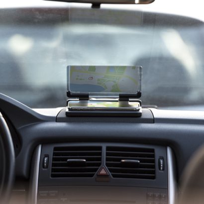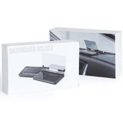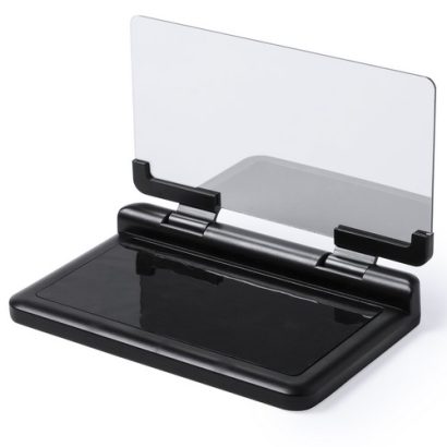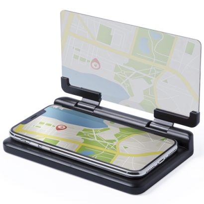 Pantalla soporte para automóvil. Con espejo duplicador de imagen ajustable y superficie anti deslizante ultra adherente para salpicadero y smartphone. Presentado en atractiva caja de diseño. Superficie Adherente