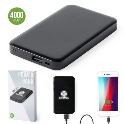 Batería auxiliar externa de 4.000 mAh de capacidad de carga. Con luz led interior y un recubrimiento exterior especialmente diseñado para marcaje en láser, con el que conseguirá que su publicidad o marca quede iluminada con luz blanca. Indicador de estado de carga, con salida USB y entrada micro USB -cable incluido-. Con amplia superficie de marcaje y presentada en atractiva caja de diseño. Las capacidades mostradas en todas nuestras baterías auxiliares externas son reales, incorporando todas ellas baterías de grado A y no recicladas, con una vida útil de al menos 500 ciclos de carga y según normativa CE. Además, están fabricadas conforme a los estándares RoHS y en cumplimiento con los siguientes requisitos de seguridad: Sistema de protección contra sobrecarga del power bank. Sistema de protección contra descarga completa que proporciona una mayor durabilidad del power bank. Sistema de bloqueo para evitar cortocircuitos. Sistema de transferencia de carga constante, acorde con Luces Led. 4000 mAh. 1 Salida USB y 1 Tipo C. Entrada Tipo C
