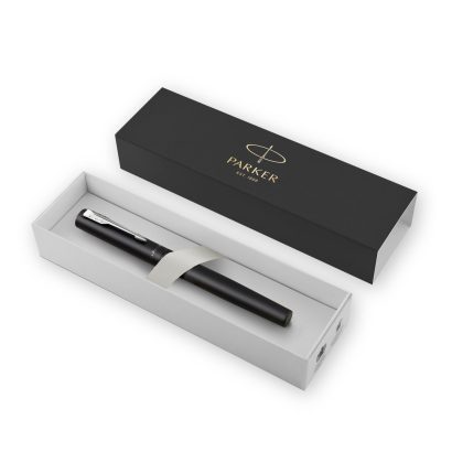 Roller Parker Vector XL, fabricado en acero inox pulido, resaltado con un adorno cromado y el inconfundible clip con la forma icónica en punta de flecha de la marca en la capucha. En tinta negra y presentado en estuche individual negro con logotipo Parker. Escritura limpia y homogénea, sin saltos, y de gran gran fluidez e intensidad. Su práctica forma cilíndrica y su resistente plumín fino de acero inoxidable permiten escribir con gran comodidad y precisión, convirtiendo al Vector XL en un instrumento de escritura tan accesible como versátil. Carga Jumbo. Tinta Negra