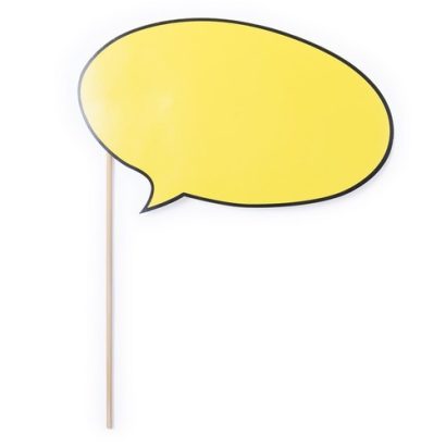 Selfie bocadillo en llamativo color amarillo con amplia superficie de impresión. En papel de alto gramaje con mango de madera.