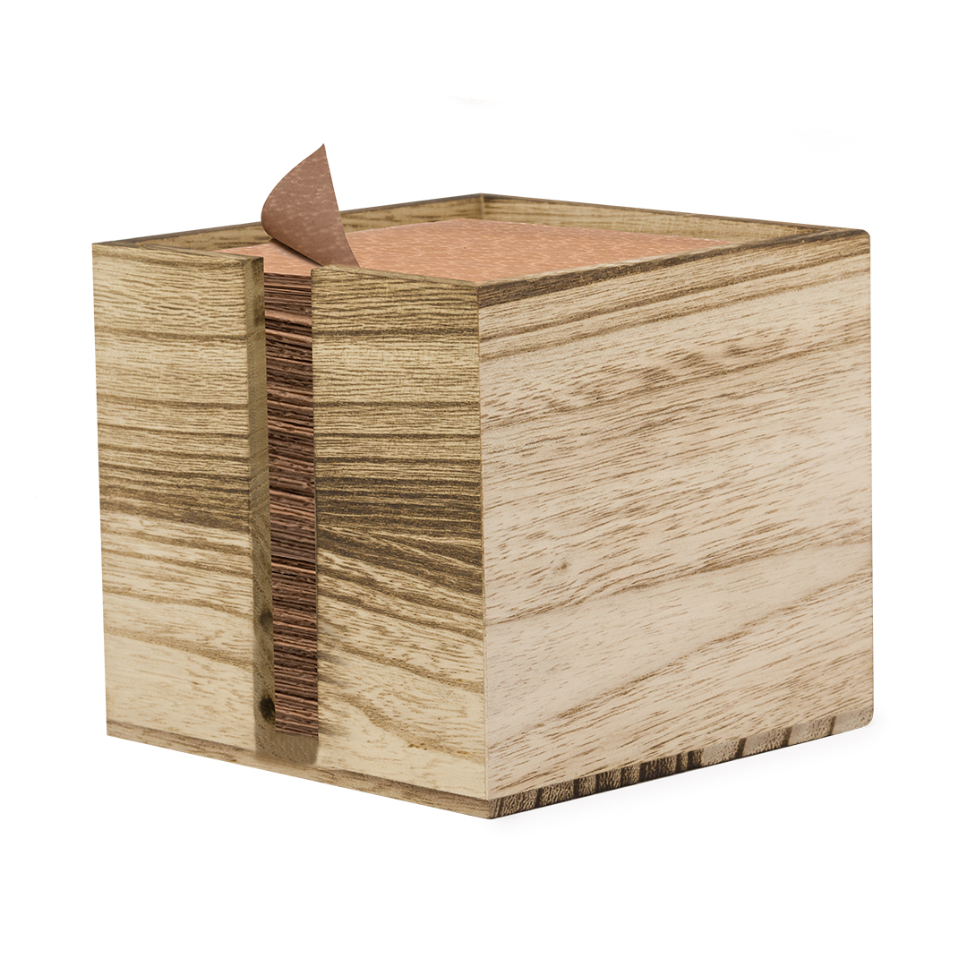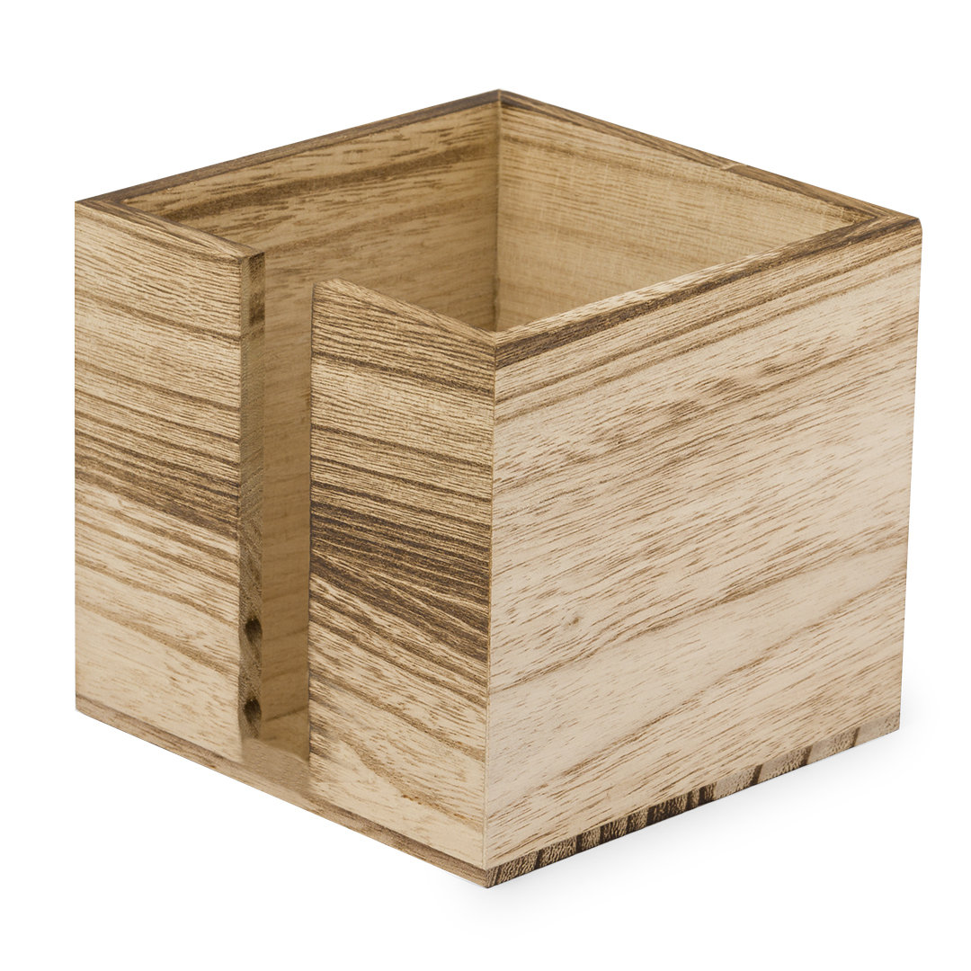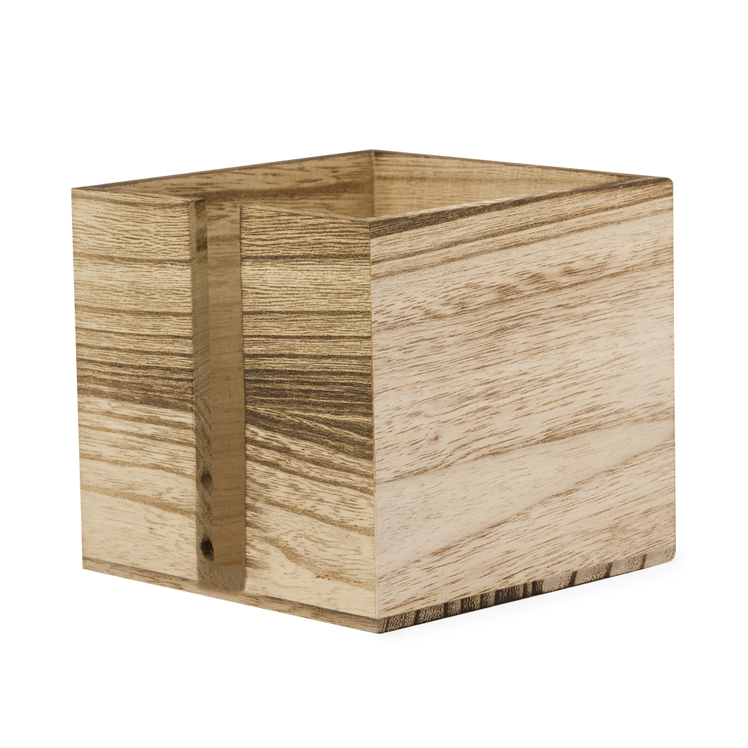 Práctico servilletero fabricado en madera. De diseño industrial, fabricado en suave madera natural con ranura en un lateral para poder coger las servillas con facilidad. Presentado en caja de diseño kraft.