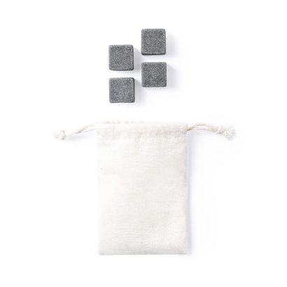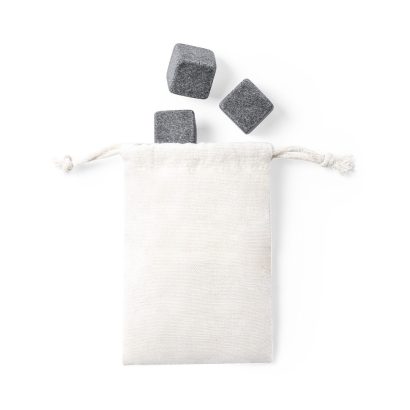 Set de 4 cubitos reutilizables. Fabricados en piedra natural esteatita, también conocida como piedra o roca de jabón, que mantiene la bebida fría sin alterar sus propiedades al no diluir su contenido en agua, además de mantener el sabor original de la misma. Presentados en funda de algodón con cordón de cierre. Reutilizable. 4 Piezas. Funda Algodón