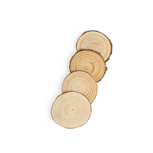 Set de posavasos en madera de pino natural. Incluye 4 piezas de aproximadamente 1cm de grosor. Corte natural, con diámetros de posavasos entre 8 y 10 cm, con cuerda en yute natural. 4 Piezas