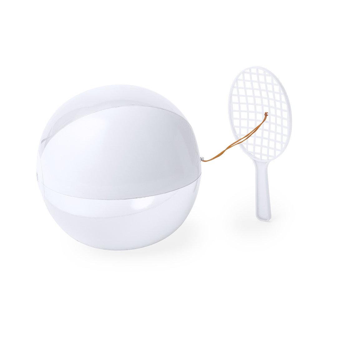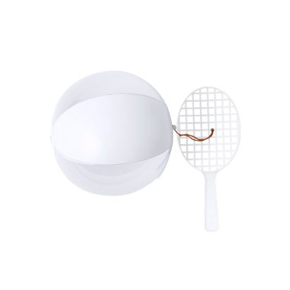 Divertido set de raqueta y balón con válvula de inflado en combinación de blanco y translúcido, unidos por un elástico. Presentado cada set en bolsa reciclada. Raqueta PP. Balón PVC
