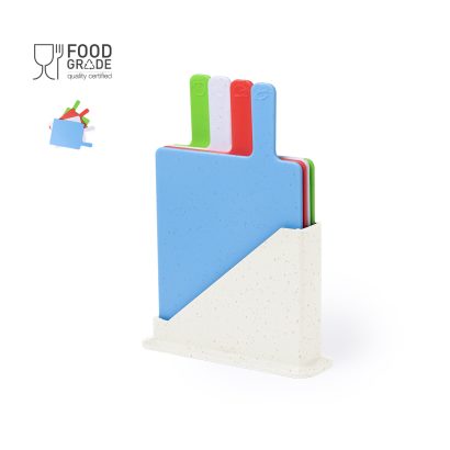 Set de tablas fabricadas en resistente PP. Incluye cuatro tablas con un soporte para un almacenamiento ordenado. Cada tabla es fácilmente identificable gracias a los dibujos grabados y los diferentes colores, para diferentes tipos de alimentos. Presentado en caja de diseño kraft. 4 Piezas