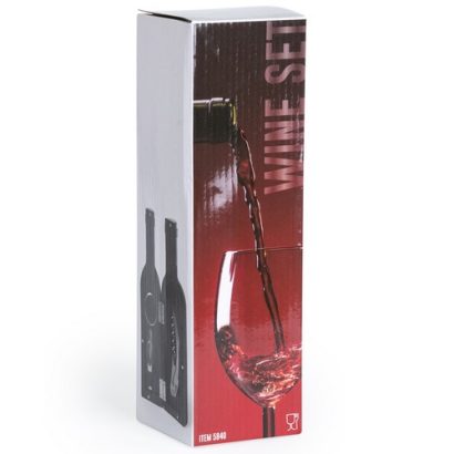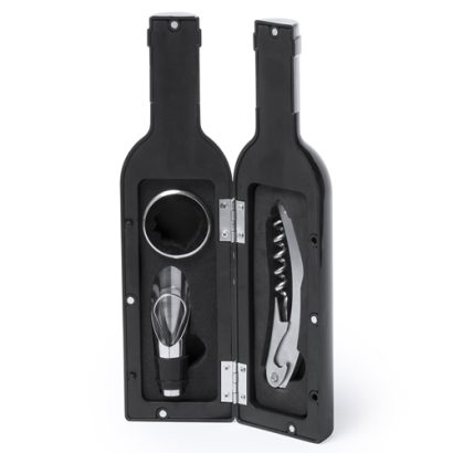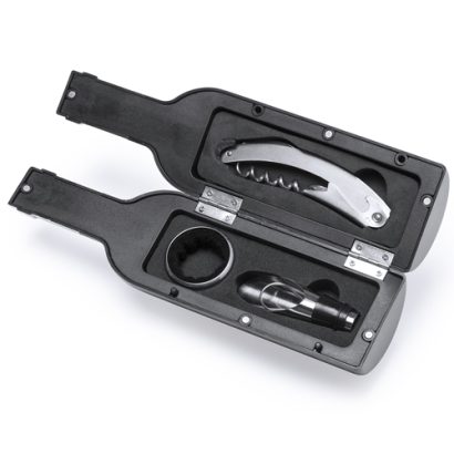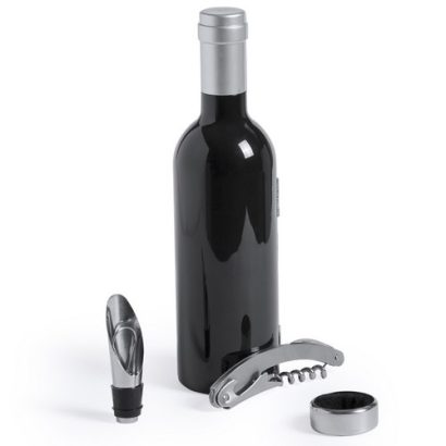 Original set de vinos en forma de botella de vino de acabado brillante, cierre magnético y accesorios de acero inox. Incluye sacacorchos con cortacápsulas y abridor, tapón dosificador, recogegotas, cortacápsulas y tapón. Presentado en estuche individual con interior en suave espuma troquelada. 3 Accesorios