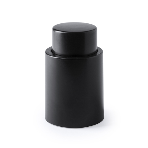 Tapón con bomba de vacío para botellas de vino en elegante diseño de color negro. Parte superior del tapón para marcaje en tampografía. Presentado en caja individual.