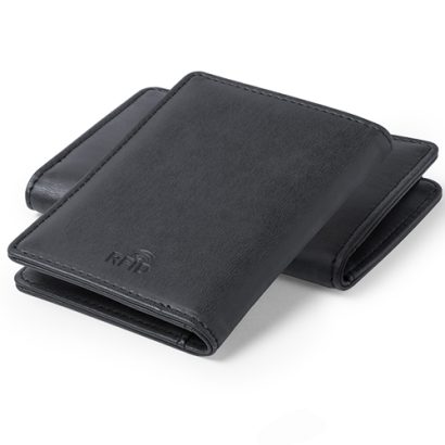 Tarjetero con tecnología de seguridad RFID (Identificación por Radio Frecuencia) que mantiene seguros tus dispositivos de transmisión de identidad. De elegante diseño, suave acabado en polipiel negra y con 8 compartimentos. Presentado en caja individual. Protector RFID. 8 Compartimentos