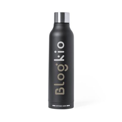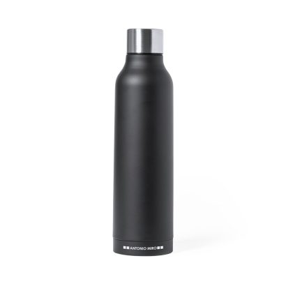 Termo en acero inox de Antonio Miró. De 500ml de capacidad y con doble pared para mejor y más duradera conservación de la temperatura. De sobrio acabado en negro satinado, logotipo de la marca en la base y con tapón cromado a rosca. Presentado en atractiva caja de diseño con logotipo de la marca. 500 ml