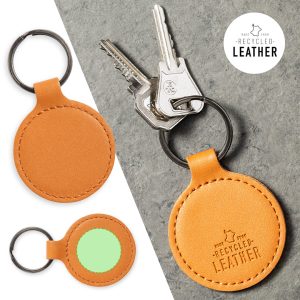 Llavero de línea nature fabricado en cuero reciclado. En tono marrón, con diseño circular y de acabado cosido. Grabado con distintivo cuero reciclado en una cara, con lado opuesto ...