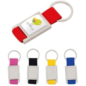 Llavero de divertido diseño con cinta de poliéster de variados y vivos colores. Con cuerpo metálico troquelado especialmente diseñado para marcaje en doming/gota de resina.