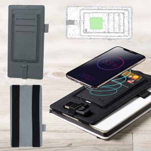 Completo organizador power bank en combinación de materiales poliéster 300D y polipiel. Cargador inalámbrico integrado en la portada, con soporte para sujeción del smartphone. Incluye batería auxiliar de 4.000 ...