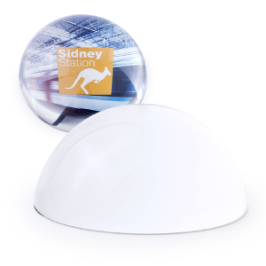 Pisapapeles de cristal semiesférico. Especialmente diseñado para marcaje digital y en láser. Presentado en estuche de protección individual troquelado con cierre magnético.