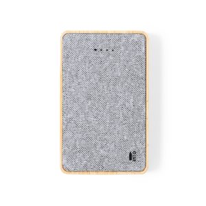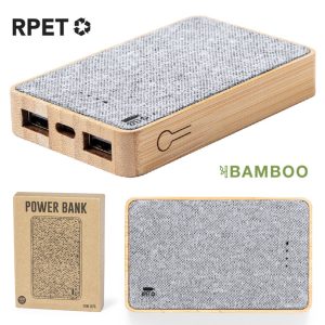 Batería auxiliar externa de 5.000 mAh, fabricada en bambú y poliéster RPET, elaborado a partir de plástico reciclado, para así fomentar la reutilización de residuos plásticos y ayudar a ...