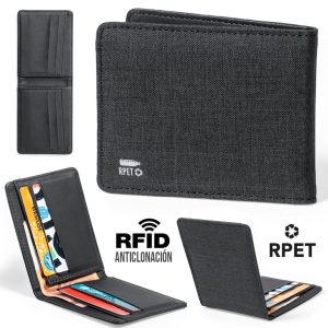 Elegante tarjetero billetero fabricado en poliéster RPET de acabado en color negro. Interior con 6 compartimentos independientes para tarjetas y amplio billetero. Con tecnología de seguridad RFID (Identificación por ...