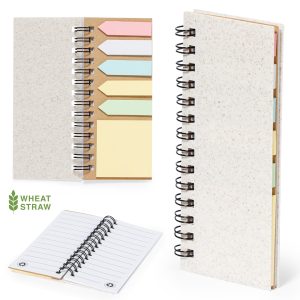 Bloc de notas con tapas en fibra de trigo. Con distintivo wheat straw en la contraportada. Incluye:Bloc de anillas de 30 hojas blancas con disposición a una raya y ...