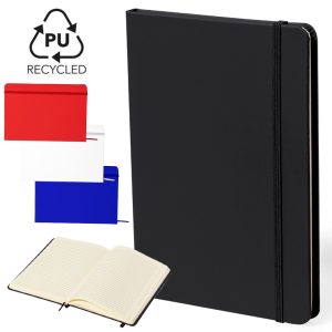 Bloc de notas con tapas rígidas elaboradas con RPET 600D. Con portada y contraportada en blanco, de 100 páginas en lisas, con banda elástica y marcapáginas en variados y ...